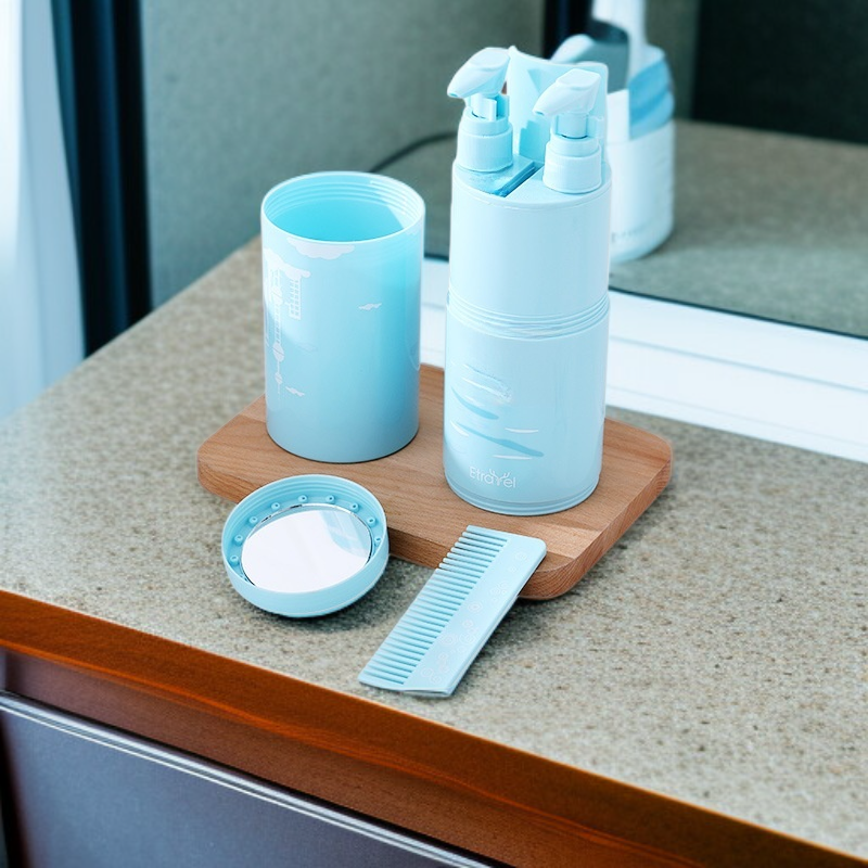 ● อุปกรณ์ดูแลช่องปากและของใช้ส่วนตัวสำหรับการเดินทาง ประกอบด้วยกล่องใส่แปรงสีฟัน แก้วน้ำ ขวดปั๊มแชมพู กระจก และหวีในชุดเดียว สะดวกครบครันใน fitting เดียว