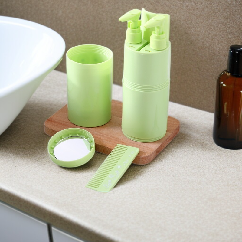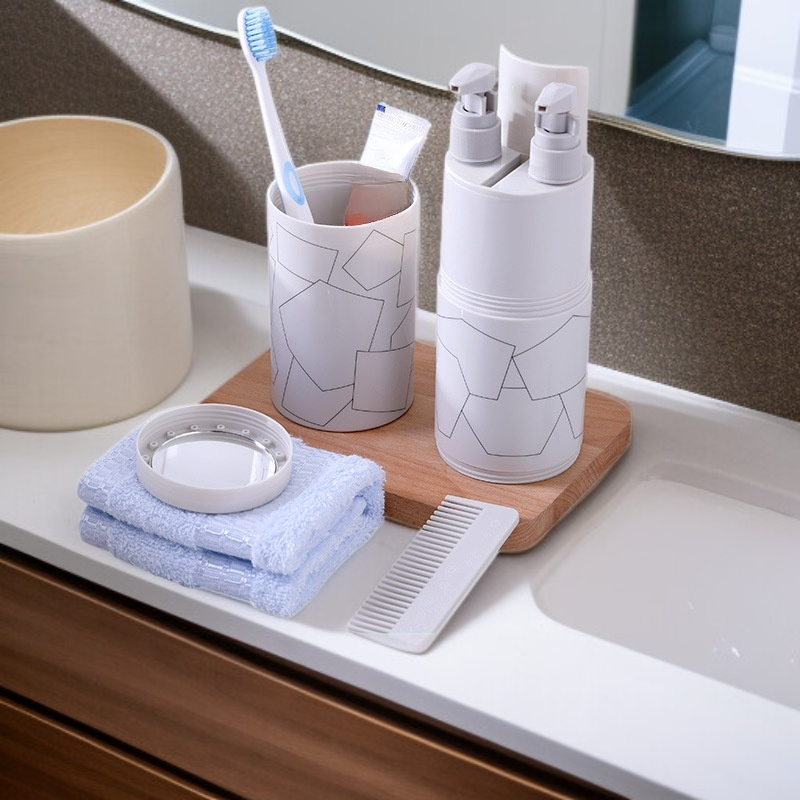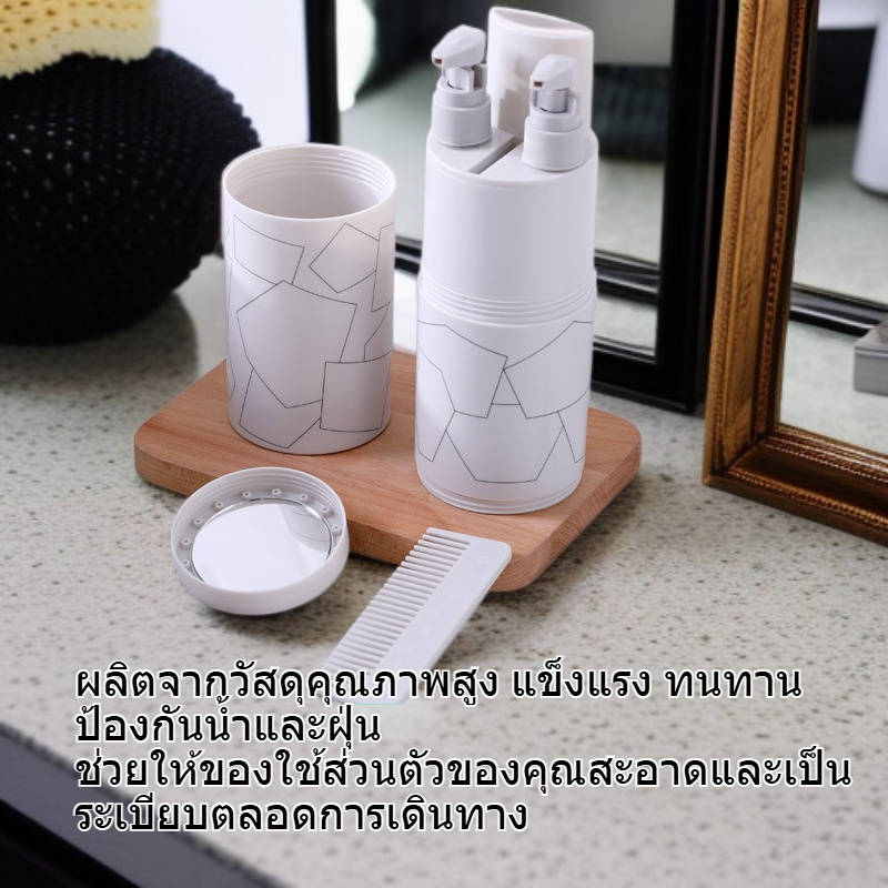 กล่องใส่แปรงสีฟันสำหรับเดินทาง, ถ้วยใส่แปรงสีฟัน, ขวดปั๊มแชมพู, กระจก, หวี, อุปกรณ์อาบน้ำสำหรับเดินทาง, ที่เก็บแปรงสีฟันสำหรับเดินทาง, กล่องใส่แปรงสีฟันสำหรับเดินทาง, กล่องใส่แปรงสีฟันสำหรับเดินทาง, กล่องใส่แปรงสีฟันสำหรับเดินทาง